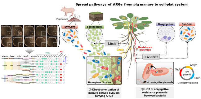课题组在国际著名学术期刊Environment International上发表了题为“Priority establishment of soil bacteria in rhizosphere limited the spread of tetracycline resistance genes from pig manure to soil-plant systems based on synthetic communities approach”的研究论文,进一步解析猪粪源ARGs在土壤-植物系统的传播途径。课题组通过培养组学获得316株猪粪源细菌,经抗生素抗性表征筛选10株细菌,利用自下而上的还原论构建简化的猪粪源合成菌群(SynCom)在土壤-拟南芥无菌栽培系统的定殖模型,发现猪粪源细菌作为主要驱动因素通过直接定殖和水平传播途径促进ARGs在系统的传播,土壤细菌群落的优势效应限制了猪粪源细菌在根际的定殖从而阻控ARGs向植物的传播。研究成果对精准防控畜禽源ARGs的传播、落实遏制细菌耐药国家行动计划和促进种养循环农业的高质量发展具有重要意义。论文的第一作者为博士后温馨,通讯作者为乐竞在线注册的吴银宝教授和德国亥姆霍兹环境研究中心-UFZ的Anja Worrich博士。