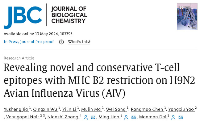近日,廖明教授/代曼曼副教授课题组在国际权威期刊Journal of Biological Chemistry在线发表了题为“Revealing novel and conservative T-cell epitopes with MHC B2 restriction on H9N2 Avian Influenza Virus (AIV)”的研究长文,解析了鸡抗性MHC B2 class I类分子的肽结合基序及其递呈抗原表位的分子机制,并新鉴定出靶向禽流感病毒的4条鸡CD8+T细胞保守抗原表位。据悉,该论文是课题组近三年继PLOS Pathogens(2023)、Journal of Immunology (2022)后,在家禽T细胞免疫研究方面取得的又一代表性成果。