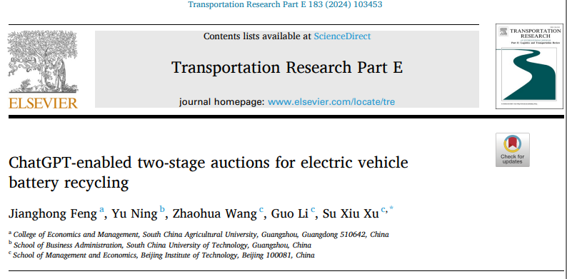日前,由我院青年教师冯江洪副教授为第一作者撰写的研究论文“ChatGPT-enabled two-stage auctions for electric vehicle battery recycling”在Transportation Research Part E: Logistics And Transportation Review(简称TRE)第183期上发表。该期刊属于运输管理和物流供应链领域的国际知名期刊,SCI&SSCI双检索,同时也是英国商学院协会(ABS)评选出的3星级期刊,中科院SCI工程技术类1区TOP期刊,且在所属的五个小类学科中均位列Q1。