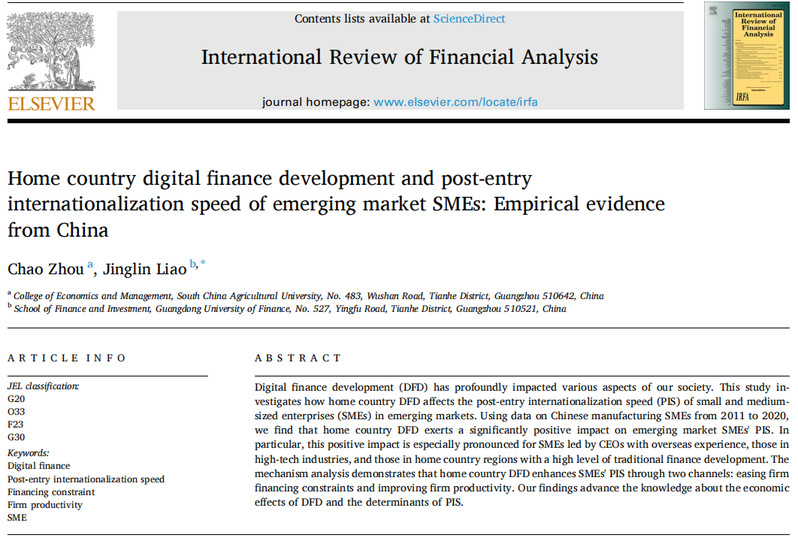 近日,经济管理学院周超副教授以第一作者在国际SSCI知名期刊International Review of Financial Analysis发表论文“Home country digital finance development and post-entry internationalization speed of emerging market SMEs: Empirical evidence from China”。