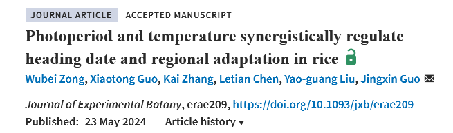 2024年5月24日,亚热带农业生物资源保护与利用国家重点实验室、生命科学学院刘耀光院士/郭晶心研究员课题组在Journal of Experimental Botany,在线发表了题为“Photoperiod and temperature synergistically regulate heading date and regional adaptation in rice”的综述。