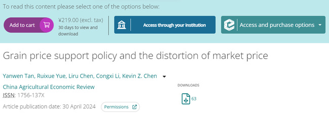 近期,经管学院谭砚文教授团队在国际重要农经期刊China Agricultural Economic Review(CAER)发表题为“Grain price support policy and the distortion of market price”的论文。