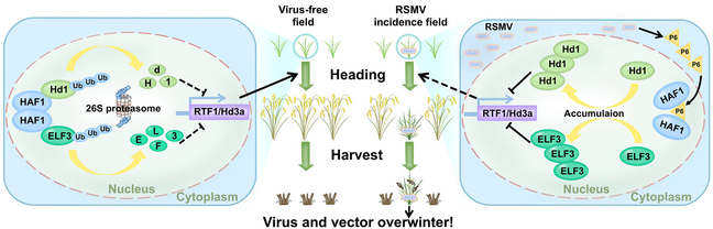 实验室研究表明,RSMV侵染的确延缓水稻发育,尤其是抽穗期比健康水稻推迟了15-20天,当健康水稻黄熟时,感染RSMV的水稻依然绿色,更加吸引叶蝉取食且更有利于叶蝉生长。进一步研究发现RSMV编码的一个只有67个氨基酸的小蛋白P6是导致水稻抽穗延迟的关键因子。蛋白互作筛选发现P6能与水稻抽穗相关的E3泛素连接酶HAF1相互作用,抑制HAF1同源二聚体的形成,并破坏HAF1与其底物蛋白Hd1和ELF3的结合和泛素化,从而抑制下游抽穗相关基因RFT1/Hd3a的表达,从而导致抽穗延迟,为病毒的介体叶蝉提供了更有利的越冬场所。