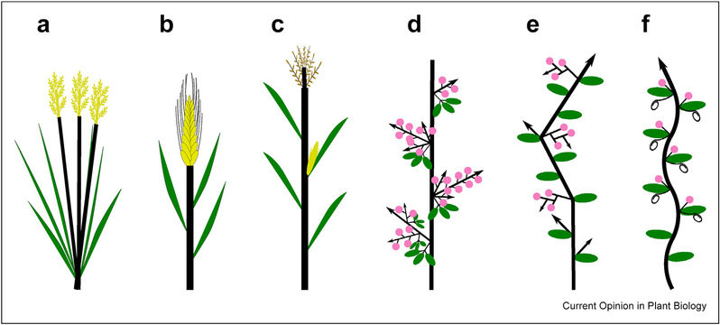 分枝是植物株型建成的重要元素,而作物的株型结构很大程度上决定了作物产量。大豆是重要的粮油饲兼用型作物,也是我国最主要的植物油脂和蛋白的来源。然而,相比于小麦水稻等谷类作物,大豆的单产近几十年来增加缓慢。其中部分的原因可以归结于大豆特殊的株型结构:即大豆的每一片复叶的叶腋处均可产生侧生分枝或腋生花序/豆荚。从发育生物学角度来说,侧生分枝和腋生花序/豆荚均来源于叶腋处的分生组织(axillary meristems,AxMs)。因此,叶腋分生组织细胞的命运决定是大豆株型建成的关键因素。再者,叶腋分生组织的分化在有花植物中呈现出丰富的变异(图1),是深入研究植物分生组织命运决定发育程序的演化和植物复杂性状形成机理的理想模型。