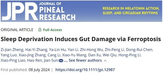 7月8日,孙坚教授团队在Journal of Pineal Research杂志上发表了题为“Sleep Deprivation Induces Gut Damage via Ferroptosis”的最新研究成果。本研究发现睡眠剥夺会导致肠道铁死亡,补充褪黑素能够缓解铁死亡造成的肠道损伤,为防治睡眠不足导致的肠道损伤提供了新的靶点和思路。