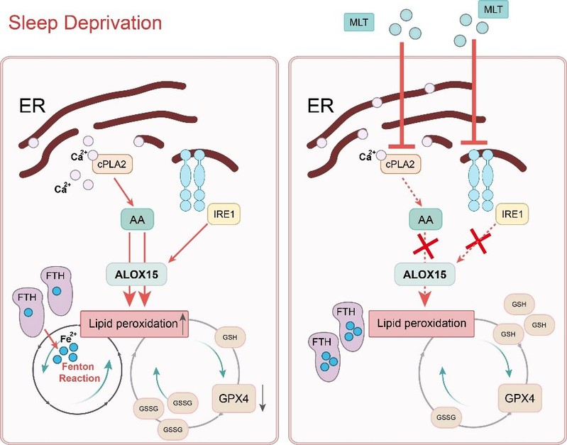 另一方面,该团队发现补充褪黑素能够通过缓解睡眠剥夺导致的铁死亡,进而恢复肠道稳态。机制研究发现褪黑素通过减少内质网应激相关的IRE1通路和钙离子蓄积,进而抑制睡眠剥夺导致的铁死亡。