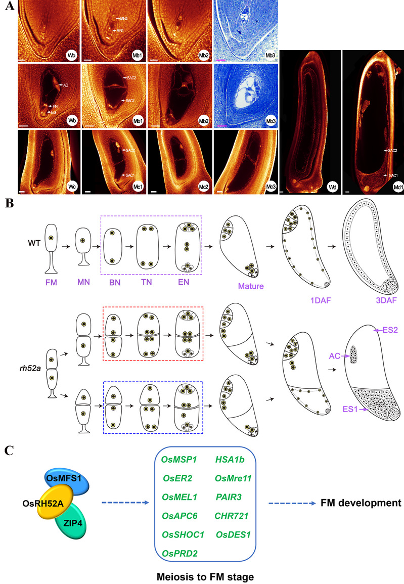 团队前期通过比较基因组学等方法研究发现DEAD-box RNA解旋酶家族成员OsRH52A在调控新型四倍体水稻育性具有重要作用,但在二倍体水稻中的功能及其育性调控机理尚不清楚。本研究中,团队通过生物信息学和遗传学等方法确定OsRH52A在二倍体水稻育性调控中也具有重要的作用,但与新型四倍体水稻的不同。研究发现OsRH52A突变后育性显著下降,幅度超过33%;通过WE-CLSM等技术深入观察发现,突变体育性降低主要是由胚囊败育性引起,与花粉育性无关(即花粉育性正常),进一步研究发现功能大孢子发育异常是引起胚囊高度败育(32.8%)的主要原因。