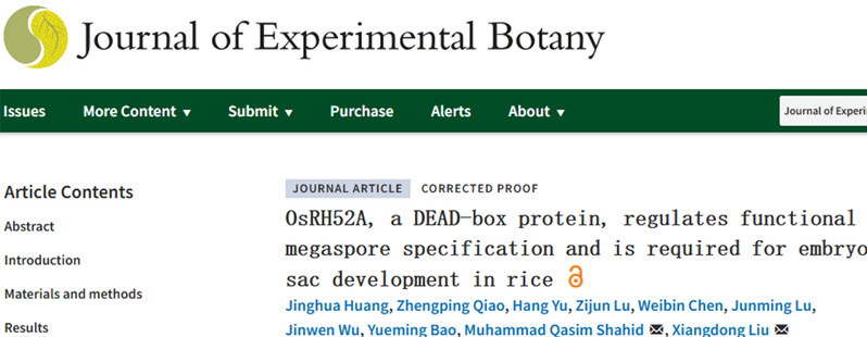 近日,乐竞在线注册农学院刘向东团队在“Journal of Experimental Botany”在线发表了题为“OsRH52A, a DEAD-Box protein, is required for embryo sac development by regulating functional megaspore specification in rice”的研究论文,揭示了DEAD-box RNA解旋酶蛋白OsRH52A在调控水稻胚囊育性具有重要的作用。