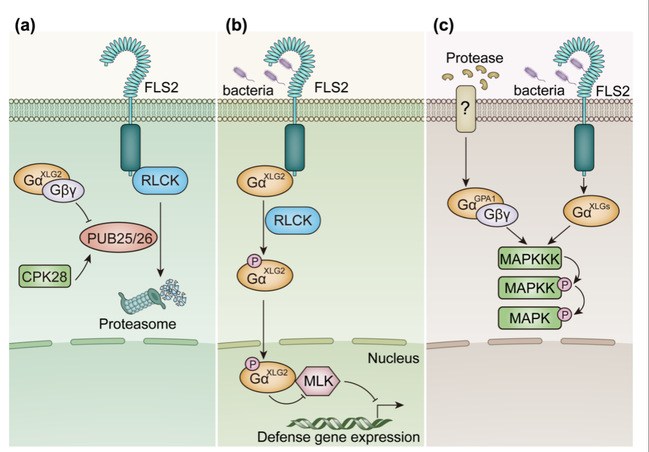在G蛋白下游信号转导方面,G蛋白与多个蛋白激酶家族存在相互作用,包括细胞质类受体激酶(RLCK)、MLK激酶、MAPK激酶等。这些激酶家族在许多生物学过程中都发挥重要功能,G蛋白通过调控这些激酶的稳定性或活性,影响其介导的下游信号途径,从而实现G蛋白下游信号转导(图2)。