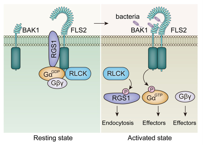 图1. RLK/RLP受体通过调控RGS1和Gα蛋白的磷酸化状态调节植物G蛋白激活