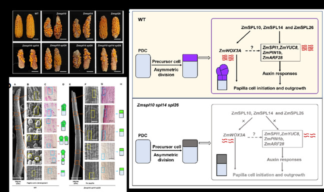 研究人员先前报道了三个同源的SPL家族转录因子,ZmSPL10、ZmSPL14和ZmSPL26促进玉米叶片表皮毛并抑制异位气孔形成的命运决定机制。它们的三重基因敲除突变体表现出叶片表面完全光滑无毛的表型,而且在本应着生刺毛和双细胞毛的位置上发育出异位气孔(Kong et al.,2021)。本研究进一步研究发现,ZmSPL10、ZmSPL14和ZmSPL26也是调控玉米柱头乳突形成的关键基因,其三重敲除突变体几乎完全缺乏柱头乳突,导致玉米果穗结实率严重减少(图1a)。系统的细胞学观察发现,柱头乳突是由柱头前体细胞不对称分裂产生的较小细胞发育形成(图1b)。原位杂交结果表明,ZmSPL10、ZmSPL14及其靶基因SPI1、ZmPIN1b、ZmARF28和ZmWOX3A在柱头乳突前体细胞中优先表达。分子生物学实验进一步揭示,ZmSPL10、ZmSPL14和ZmSPL26直接结合SPI1、ZmPIN1b、ZmARF28和ZmWOX3A的启动子并促进其表达,共同促进了柱头乳突的发育(图1c)。遗传水平上,Zmwox3a敲除突变体在柱头乳突形成和结实能力方面表现出严重的缺陷。此外,研究人员将水稻中ZmSPL10、ZmSPL14和ZmSPL26的同源基因OsSPL5和OsSPL10敲除后,Osspl5 Osspl10缺失突变体同样表现出柱头乳突发育异常且结实率显著降低,表明SPL基因在调控柱头乳突发育方面的保守性。研究结果为解析玉米柱头乳突发育的调控机制和谷类作物授粉效率的遗传改良提供重要的理论指导和基因资源。