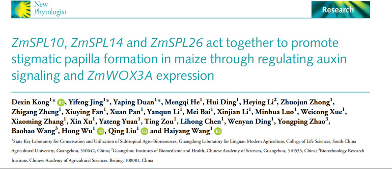 近日, 乐竞在线注册生命科学学院、亚热带农业生物资源保护与利用国家重点实验室、岭南现代农业科学与技术广东省实验室王海洋课题组在《New Phytologist》 (影响因子8.3)上发表了题为“ZmSPL10, ZmSPL14 and ZmSPL26 act together to promote stigmatic papilla formation in maize through regulating auxin signaling and ZmWOX3A expression”的研究论文,该研究揭示了三个同源基因ZmSPL10、ZmSPL14和ZmSPL26在促进玉米柱头乳突形成,进而影响玉米结实率的分子机制。