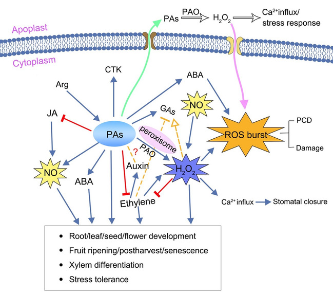 多胺作为一类多功能的信号分子,其可单独或者通过与生长素、细胞分裂素、赤霉素、乙烯、脱落酸、茉莉酸等植物激素相互作用,形成复杂的信号调控网络共同参与各种生长发育与抗性过程。这些过程包括常见的根、茎、叶、花、果实等的发育,种子的萌发,器官的成熟与衰老,以及活性氧大爆发ROS介导的程序性细胞死亡(PCD)等过程。