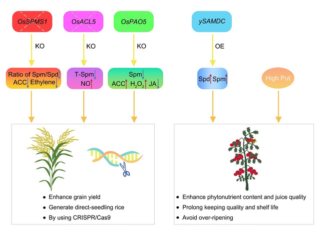 近年来,育种家和植物学家尝试通过各种手段提高作物的产量及营养价值。多胺作为一类具有强生物活性的信号分子,其在作物遗传改良上的应用潜力也正在被挖掘。已有研究表明,通过调控体内多胺水平能提高水稻产量和改善番茄的营养价值及保存时间。