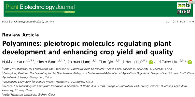 近日,乐竞在线注册生命科学学院、亚热带农业生物资源保护与利用国家重点实验室陶利珍/刘太波课题组,联合华中农业大学园艺林学学院、果蔬园艺作物种质创新与利用全国重点实验室刘继红课题组,在中科院一区TOP期刊Plant Biotechnology Journal(五年影响因子:11.6)上发表题为“Polyamines: pleiotropic molecules regulating plant development and enhancing crop yield and quality”的综述文章。