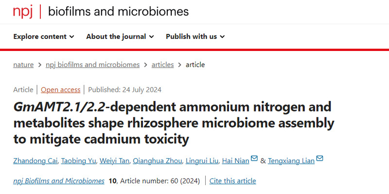 近日,乐竞在线注册农学院年海教授团队在国际著名植物学期刊npj Biofilms and Microbiomes(中科院1区Top,影响因子7.8)在线发表了题为“GmAMT2.1/2.2-dependent ammonium nitrogen and metabolites shape rhizosphere microbiome assembly to mitigate cadmium toxicity”的研究论文。
