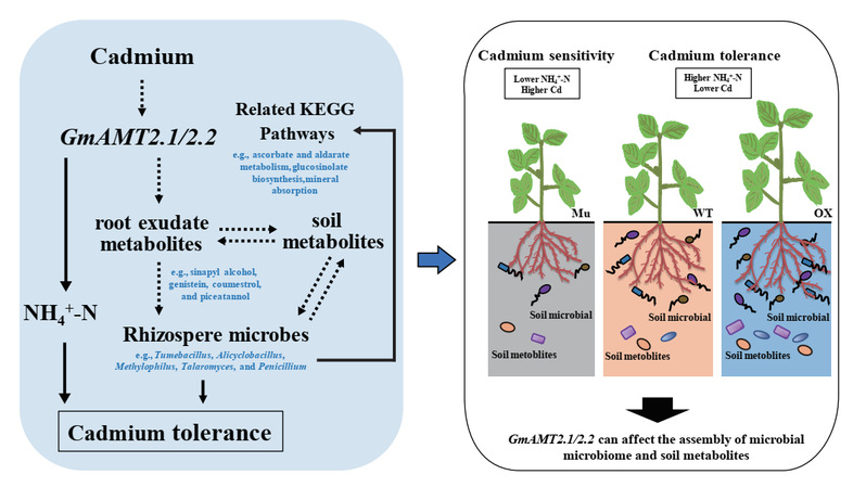 GmAMT2.1/2.2基因赋予大豆镉抗性和植物生长的假设机制示意图