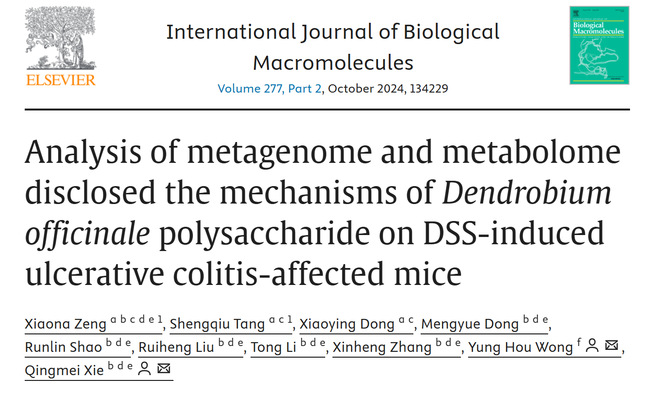 近日,International Journal of Biological Macromolecules(一区TOP期刊,Impact Factor 7.7)发表了动物科学学院谢青梅教授团队题目为“Analysis of metagenome and metabolome disclosed the mechanisms of Dendrobium officinale polysaccharide on DSS-induced ulcerative colitis-affected mice”的研究论文。