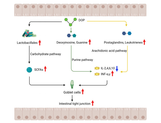 课题组围绕天然活性物质DOP调控UC小鼠肠道损伤修复机制开展研究。本论文通过DSS造模急性UC小鼠模型,发现饲喂DOP可以改善DAI指数,缓解DSS造成的体重减轻,提高机体抗氧化水平,调节炎性因子表达,提高肠道紧密连接蛋白表达水平,提高肠道益生菌丰度,以及改善肠道屏障功能。进一步结合宏基因组和代谢组学分析,阐明了DOP调控DSS诱导的急性UC小鼠的作用机制。