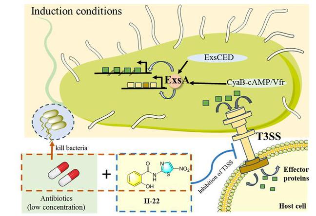 铜绿假单胞菌(Pseudomonas aeruginosa)是一种重要的条件性致病菌,由于其自身具有强大的致病性,且其不断增长的抗生素耐药性对公共卫生安全构成了严峻威胁。目前对抗铜绿假单胞菌感染最常用的是抗生素疗法。大多数抗生素通过杀死细菌来达到治疗目的,这会加速病原菌对抗生素的耐药性。目前研究显示,铜绿假单胞菌自身强大的耐药性已经成为了铜绿假单胞菌治疗过程中面临的最大困难。随着铜绿假单胞菌耐药性越来越强,用于治疗铜绿假单胞菌感染的抗生素越来越少,迫切需要寻找治疗铜绿假单胞菌感染的新方法。III 型分泌系统(Type III secretion system,T3SS)是铜绿假单胞菌中重要的毒力因子。与传统抗生素作用机理不同,III型分泌系统抑制剂在不影响细菌生长的情况下,特异性靶向T3SS毒力因子,从而降低病原菌的致病性。这样不会对铜绿假单胞菌产生生存压力,能在有效抑制细菌毒力的同时减缓抗性的产生。