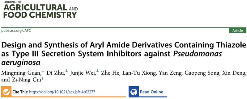近日,乐竞在线注册群体微生物研究中心崔紫宁教授团队在铜绿假单胞菌(Pseudomonas aeruginosa)III型分泌系统(T3SS)抑制剂方面取得新进展,相关研究结果在农林科学领域一区TOP期刊Journal of Agricultural and Food Chemistry在线发表(DOI: 10.1021/acs.jafc.4c02277)。论文题目为Design and Synthesis of Aryl Amide Derivatives Containing Thiazole as Type III Secretion System Inhibitors against Pseudomonas aeruginosa。