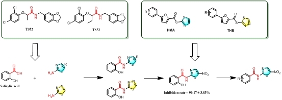 本研究设计合成了一系列含噻唑的芳基酰胺类衍生物。利用荧光报告体系、生长曲线测试、大蜡螟幼虫接种等手段对该系列化合物进行生物活性评价,获得了1个防效优异且特异性靶向铜绿假单胞菌III型分泌系统的抑制剂。