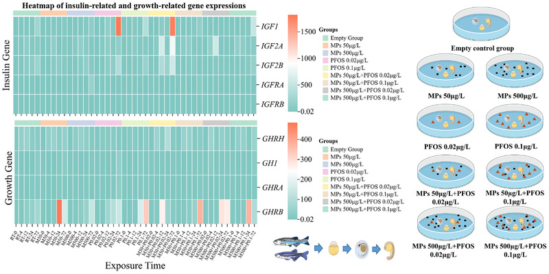 该研究探讨了微塑料和PFOS单独及联合暴露对斑马鱼胚胎发育过程中胰岛素样生长因子和生长激素相关基因表达的影响。研究发现,低浓度的微塑料(50 μg/L)和PFOS(0.02 μg/L)在短时间内就能显著激活基因表达。高浓度的微塑料(500 μg/L)和PFOS(0.1 μg/L)不仅能迅速激活基因表达,还能维持高表达水平更长时间。在联合暴露的情况下,低浓度组和高浓度组的基因表达峰值主要出现在处理后12小时内。值得注意的是,联合暴露组对基因表达的影响比单独暴露组更为显著,表明微塑料和PFOS之间存在协同调节效应。