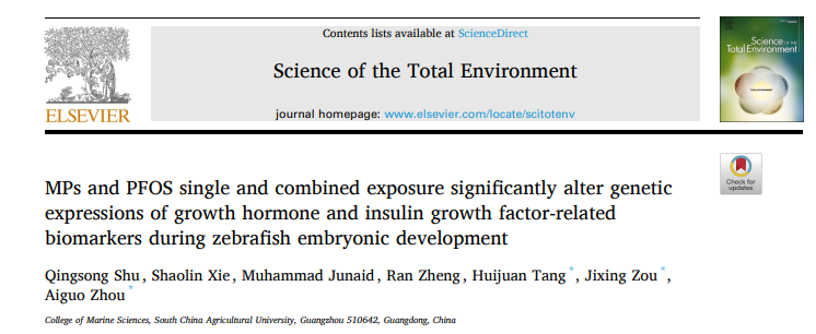 近日,乐竞在线注册海洋学院水产育种与健康养殖团队邹记兴/周爱国/唐汇娟课题组Science of the Total Environment(中科院1区Top,影响因子8.2)在线发表了题为“MPs and PFOS single and combined exposure significantly alter genetic expressions of growth hormone and insulin growth factor-related biomarkers during zebrafish embryonic development”的研究论文。
