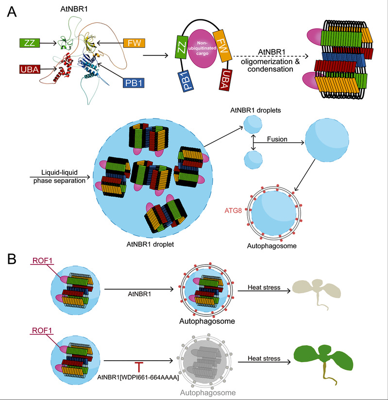 研究人员通过对植物NBR1的结构域进行了分析,并且与后生动物p62和NBR1进行了分析与比较,构建了不同功能结构域的突变,以研究AtNBR1与已知的非泛素化货物ROF1和Exo70E2的相互作用模式。通过荧光共定位、酵母双杂交、双荧光素酶标记和免疫共沉淀实验表明AtNBR1降解非泛素化底物需要ZZ和FW结构域的共同参与。 此外,研究还发现,AtNBR1在ATG8介导的自噬体形成之前发生液-液相分离,且这一过程对拟南芥的高温胁迫耐受能力至关重要。该研究首次发现了拟南芥NBR1的相分离能力和发生过程,揭示了其与非泛素化底物相互作用模式和在植物自噬中的双重功能,即自噬底物识别和液-液相分离,进一步深化了我们对植物中NBR1介导自噬机制的理解,相较于动物的研究提供了全新的视角。该研究不仅为植物自噬机制提供了新知识,也为进一步研究植物自噬在高温胁迫中的调控机制和生物学功能奠定了基础。