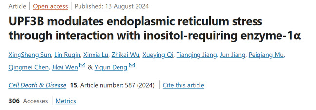 近日,生命科学学院邓诣群教授团队在生物学一区TOP期刊《Cell Death & Disease》在线发表题为“UPF3B modulates endoplasmic reticulum stress through interaction with inositol-requiring enzyme-1α”的研究论文,该研究发现UPF3B与IRE1α互作抑制细胞内质网应激,揭示了无义介导的mRNA衰变(NMD)在细胞应激响应中的新型调控机制。