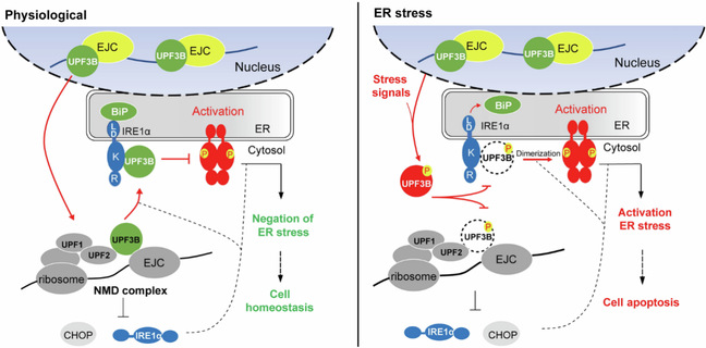 UPF3B在NMD和内质网应激中的双重作用模式图