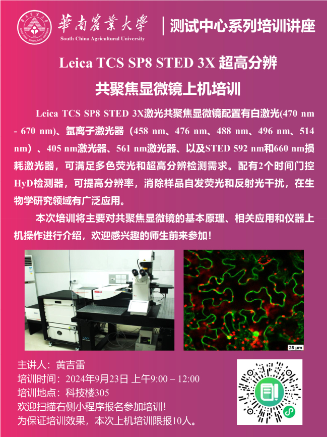 115周年校庆“学术华农”系列活动之0302:测试中心系列培训讲座:Leica TCS SP8 STED 3X超高分辨共聚焦显微镜上机培训