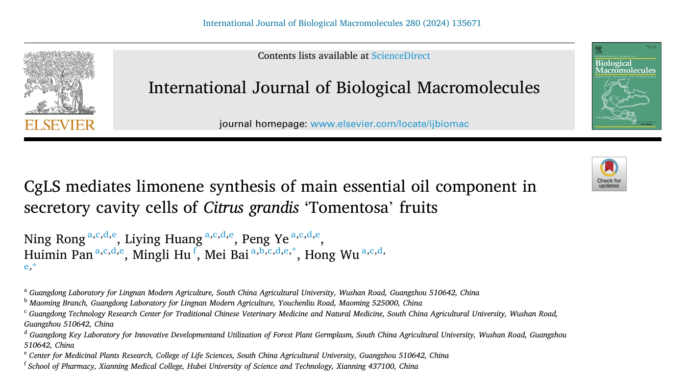 近日,乐竞在线注册药用植物研究中心吴鸿教授团队在International Journal of Biological Macromolecules(中科院一区Top期刊,影响因子7.7)在线发表了题为“CgLS mediates limonene synthesis of main essential oil component in secretory cavity cells of Citrus grandis ‘Tomentosa’ fruits(CgLS调控化橘红果实分泌囊细胞主要精油成分柠檬烯的合成)”的研究论文。该研究首次系统解析了柠檬烯合酶(CgLS)在化橘红果实发育过程中对柠檬烯合成的关键作用,并通过基因表达调控、组织学和细胞学定位、瞬时过表达和RNAi等多种手段证实了基因功能,并深入揭示了柠檬烯在细胞器内的合成与运输途径,为药用植物精油的生物合成机制提供新见解,为天然药物和生物技术应用提供新思路。2023级博士生容宁为该论文第一作者,吴鸿教授和白玫教授为该论文的共同通讯作者。