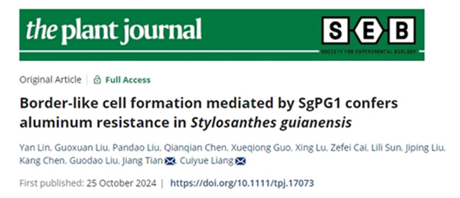 近日,资源环境学院根系生物学研究中心、亚热带农业生物资源保护与利用国家重点实验室,梁翠月研究员课题组在The Plant Journal(中科院一区Top期刊)发表了题为“Border-like cell formation mediated by SgPG1 confers aluminum resistance in Stylosanthes guianensis”的研究论文。