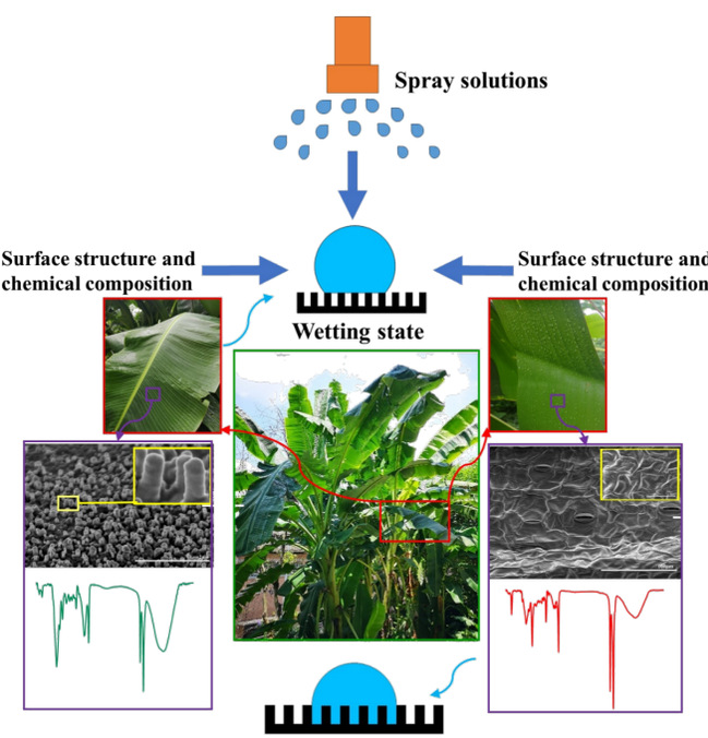 对香蕉不同生长阶段的叶表面特征进行了研究,表征了不同生长阶段叶片表面微观结构的变化,并检测了不同供试溶液在叶片表面的接触角(CA),香蕉叶片不同生长阶段的表面自由能 (SFE)以及极性和非极性成分。不同生长阶段叶片的润湿行为揭示了叶片表面的润湿性能与叶片表面特性以及农药表面张力之间存在显著相关性 。