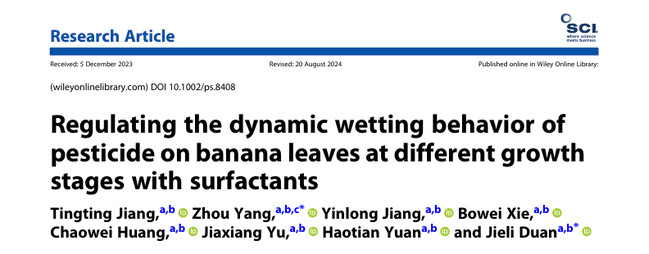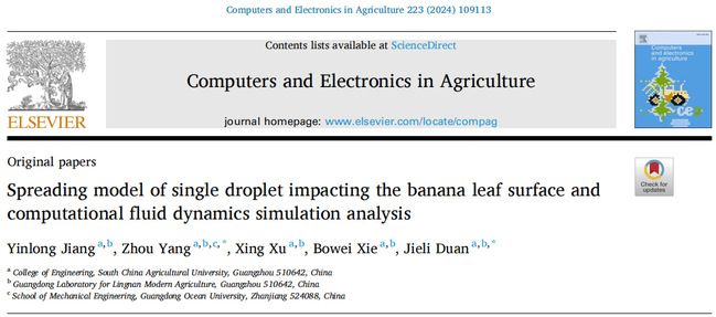 近日,乐竞在线注册工程学院杨洲/段洁利团队在国际知名期刊Computers and Electronics in Agriculture(中科院一区Top)、Pest Management Science(中科院一区Top)上分别发表题为“Regulating the dynamic wetting behavior of pesticide on banana leaves at different growth stages with surfactants”“Spreading model of single droplet impacting the banana leaf surface and computational fluid dynamics simulation analysis”“Performance matching of common pesticides in banana plantations on the surface of banana leaves at different growth stages”的研究论文。开展了香蕉园常见农药在不同生长阶段香蕉叶片表面的性能匹配、表面活性剂调控农药在不同生长时期对香蕉叶片的动态润湿行为、喷雾雾滴撞击香蕉叶表面的扩散模型及计算流体力学仿真分析研究,为蕉园机械化植保作业雾滴高效润湿沉积提供了新的研究思路和方法。