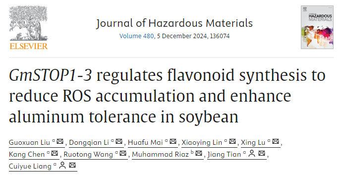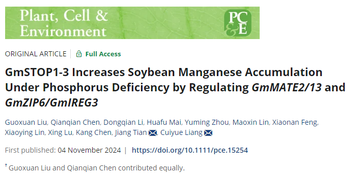 资源环境学院根系生物学研究中心、亚热带农业生物资源保护与利用国家重点实验室梁翠月研究员课题组在Plant, Cell & Environment和Journal of Hazardous Materials(中科院一区Top期刊)分别在线发表了题为“GmSTOP1-3 Increases Soybean Manganese Accumulation Under Phosphorus Deficiency by Regulating GmMATE2/13 and GmZIP6/GmIREG3”和“GmSTOP1-3 regulates flavonoid synthesis to reduce ROS accumulation and enhance aluminum tolerance in soybean”等系列研究论文。揭示了大豆“顾此失彼”地应对酸性土壤养分胁迫的机制。