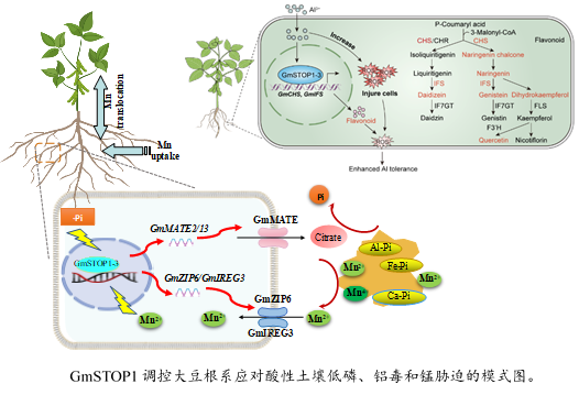 我国酸性土壤面积约占全国土地面积的21%。酸性土壤中限制作物生产的主要因子包括养分有效性低(如:氮、磷)和金属毒害(如:铝、锰)等。因此,阐明大豆综合适应酸性土壤低磷、铝、锰胁迫的调控机制,是实现大豆在南方扩种的重要理论基础。该研究发现,大豆C2H2锌指蛋白转录因子基因GmSTOP1-3的表达水平受低磷、铝和锰处理上调。超量表达GmSTOP1-3不仅提高了大豆植株磷效率,增强其耐铝毒能力,同时也提高了植株的锰敏感性。综合转录组和代谢组分析,发现GmSTOP1-3通过增加根系有机酸分泌及改变黄酮类物质合成代谢途径,增强大豆耐铝毒能力。然而,GmSTOP1-3调控的根系有机酸分泌同时也增加了土壤锰有效性,导致植株锰的过量累积。结合酵母单杂,双荧光素酶报告基因检测,以及凝胶迁移等实验证明,GmSTOP1-3能够直接激活膜定位柠檬酸转运蛋白编码基因GmMATE2/13的表达,促进大豆根系柠檬酸的分泌;同时也直接激活了金属转运蛋白基因GmZIP6/GmIREG3的表达,促进锰的吸收。因此,在酸性土壤上,大豆GmSTOP1-3调控有机酸分泌促进根尖耐铝毒和活化难溶无机磷的同时,不可避免地增加了土壤可溶态和交换态Mn2+的含量,而金属转运蛋白基因表达水平的提高也直接促进锰的吸收,导致大豆植株锰中毒的现象。