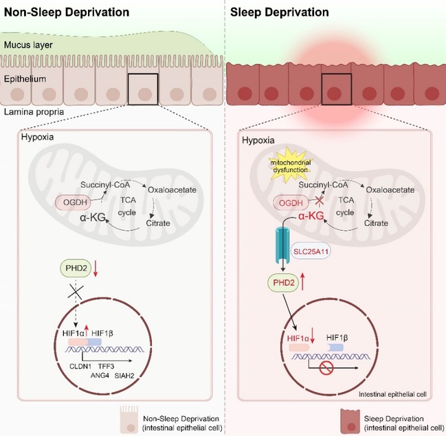 肠道损伤和肠道修复的平衡对于维持肠道健康非常重要。在2024年8月,孙坚教授曾发现睡眠剥夺会导致肠道发生铁死亡(相关成果发表于Journal of Pineal Research. 2024 Aug; 76(5):e12987.)。本研究从另一个视角,研究了睡眠剥夺对肠道修复功能的影响,更加全面地解释了睡眠剥夺对于肠道损伤的具体机制。通过对睡眠剥夺小鼠的肠道的转录组分析,发现睡眠剥夺导致肠道缺氧,但是介导肠道修复的缺氧诱导因子HIF1α的表达失调。进一步机制研究发现,睡眠剥夺会导致代谢紊乱,造成代谢物α-酮戊二酸在肠道中积累,进而激活了脯氨酸羟基酶PHD2,从而抑制了HIF1α的表达,加剧了睡眠剥夺对肠道的损伤。以上研究为治疗慢性应激导致的肠道屏障损伤的药物开发,提供了新的靶点。