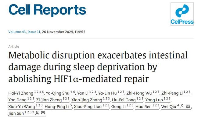 11月10日,兽医学院、国家兽医微生物耐药性风险评估实验室、广东省兽药研制与安全评价重点实验室的孙坚教授在国际权威期刊Cell Reports(影响因子7.5)上在线发表了 “Metabolic disruption exacerbates intestinal damage during sleep deprivation by abolishing HIF1α-mediated repair”的研究性论文。本研究发现了睡眠剥夺期间,代谢紊乱通过抑制HIF1α介导的修复功能,加剧了肠道损伤的分子机制。