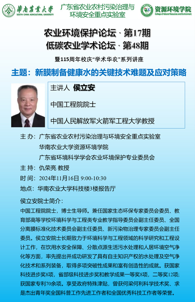 115周年校庆“学术华农”系列活动之0440:侯立安院士主题报告|新膜制备健康水的关键技术难题及应对策略