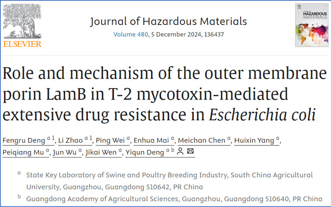 11月5日,乐竞在线注册生命科学学院邓诣群教授团队在Journal of Hazardous Materials期刊(中科院一区TOP期刊,影响因子12.2)上在线发表了题为“Role and mechanism of the outer membrane porin LamB in T-2 mycotoxin-mediated extensive drug resistance in Escherichia coli”的研究论文。该研究探讨了霉菌毒素对抗生素耐药性演化的影响,揭示了特异性孔蛋白在这一过程中的重要作用。