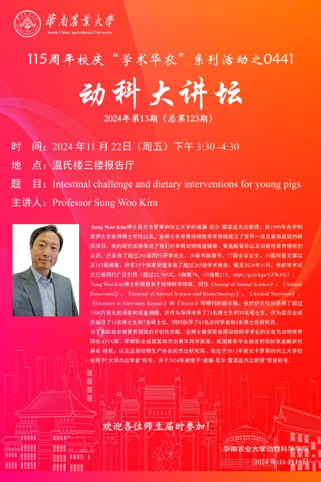 115周年校庆“学术华农”系列活动0441:动科大讲坛:Intestinal challenge and dietary interventions for young pigs