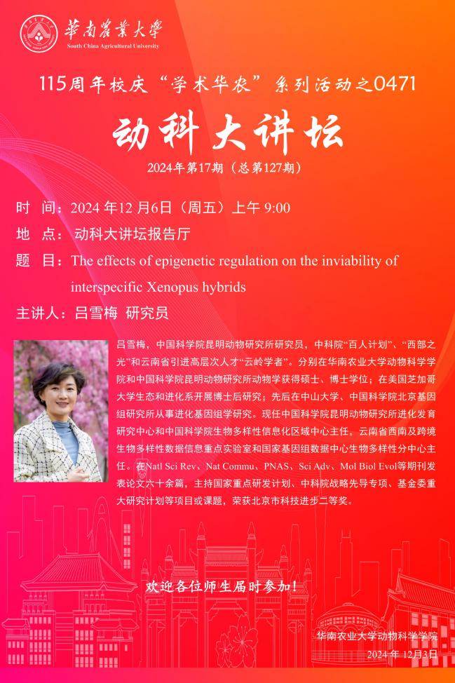 115周年校庆“学术华农”系列活动之0471:动科大讲坛:The effects of epigenetic regulation on the inviability of interspecific Xenopus hybrids