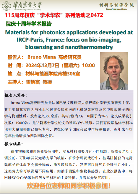 115周年校庆“学术华农”系列活动之0472: 材能学院学术报告:Materials for photonics applications developed at IRCP-Paris, France: focus on bio-imaging, biosensing and nanothermometry