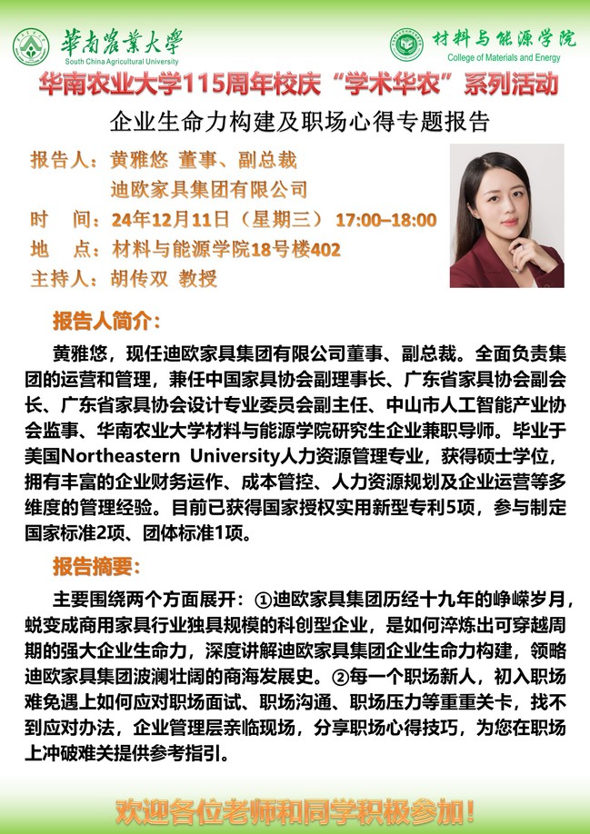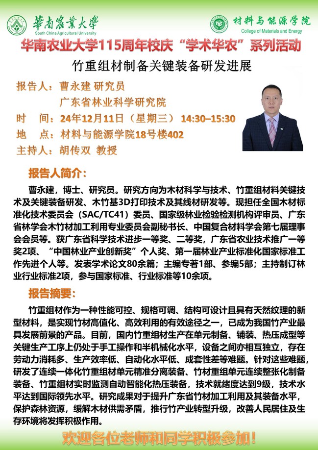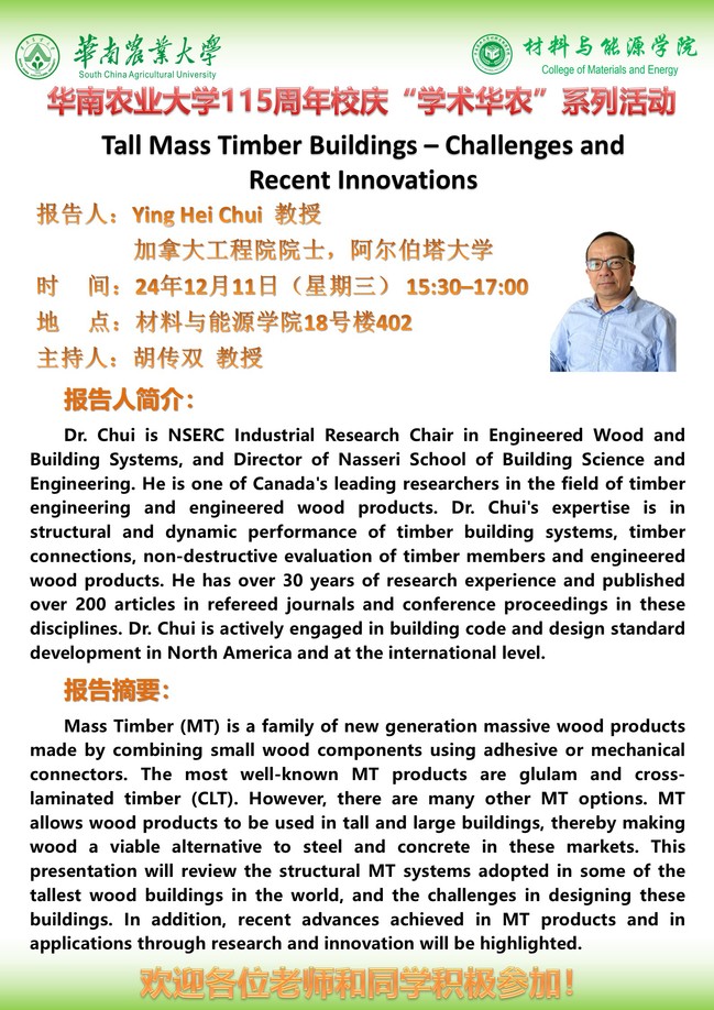 115周年校庆“学术华农”系列活动之0475:材能学院学术报告:(1)竹重组材制备关键装备研发进展;(2)Tall Mass Timber Buildings-Chanllenges and Recent Innovations;(3)企业生命力构建及职场心得专题报告