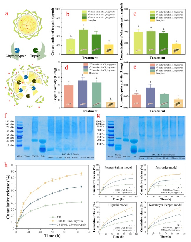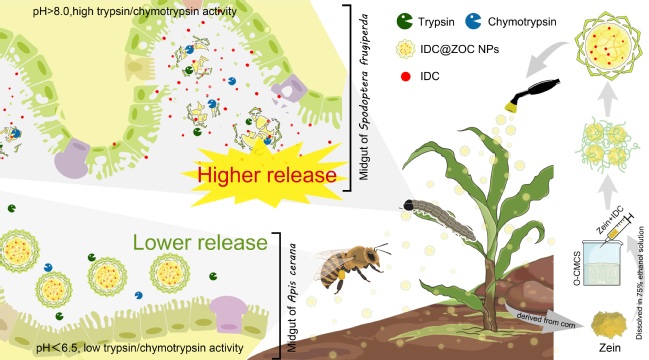 该研究基于草地贪夜蛾和中华蜜蜂肠道pH和消化酶活性差异,构建了一种生物基聚合物纳米颗粒(IDC@ZOC NPs),实现茚虫威(IDC)在草地贪夜蛾幼虫肠道选择性释放,显著提高了茚虫威对草地贪夜蛾的杀虫活性,在蜜蜂肠道不释放或少释放,提高了对蜜蜂的安全性。