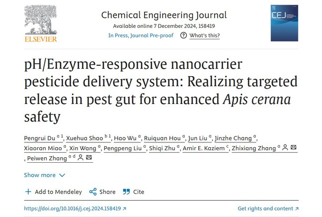 近日,植物保护学院/绿色农药全国重点实验室硕士生杜澎锐,在国际知名刊物Chemical Engineering Journal(1区,影响因子13.3),发表了题为“pH/Enzyme-responsive nanocarrier pesticide delivery system: Realizing targeted release in pest gut for enhanced Apis cerana safety” 的研究论文。