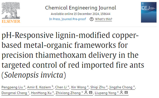 近日,乐竞在线注册植物保护学院/绿色农药全国重点实验室硕士生刘鹏鹏,在国际知名刊物《Chemical Engineering Journal》(1区,IF=13.3)上,发表了题为“pH-Responsive Lignin-Modified Copper-Based Metal-Organic Frameworks for Precision Thiamethoxam Delivery in the Targeted Control of Red Imported Fire Ants (Solenopsis invicta)”的研究论文。