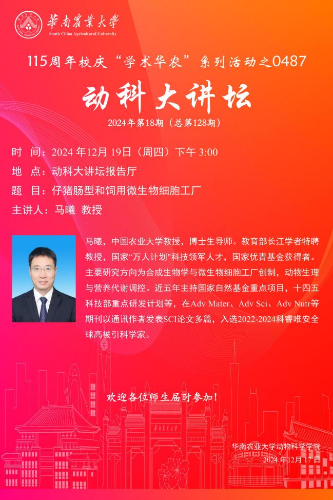115周年校庆“学术华农”系列活动之0487:动科大讲坛:仔猪肠型和饲用微生物细胞工厂